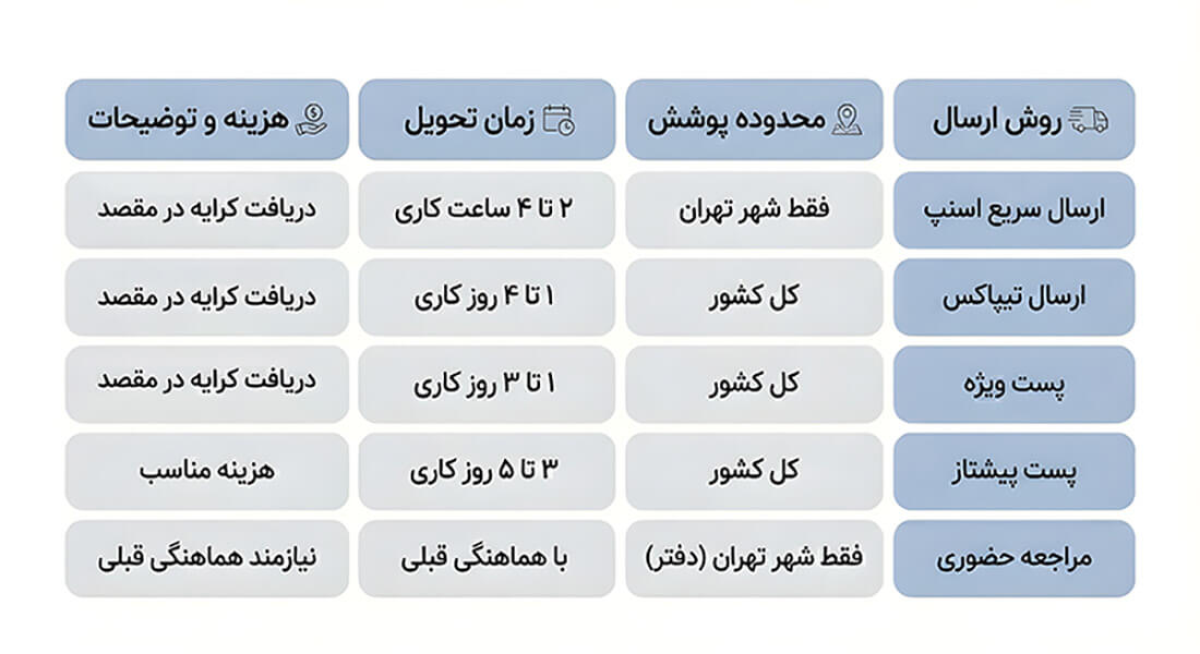 نکته مهم: زمانهای تحویل اعلام شده، مربوط به زمان تخمینی شرکتهای پستی بوده و در روزهای کاری محاسبه میشود (روز کاری: شنبه تا پنجشنبه به جز تعطیلات رسمی)
