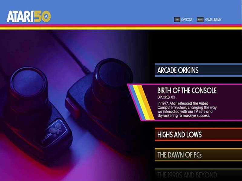 دسته بندی زیبا و جذابی که برای بازی Atari 50 The Anniversary Celebration ارائه شده است، شامل Arcade Origins، The Dawn of PC، Highs and Lows، Birth of the Console و The 1990s and Beyond بوده و این طرح بندی ها بر اساس زمان بندی عرضه و ارائه بازی ها صورت گرفته است.
