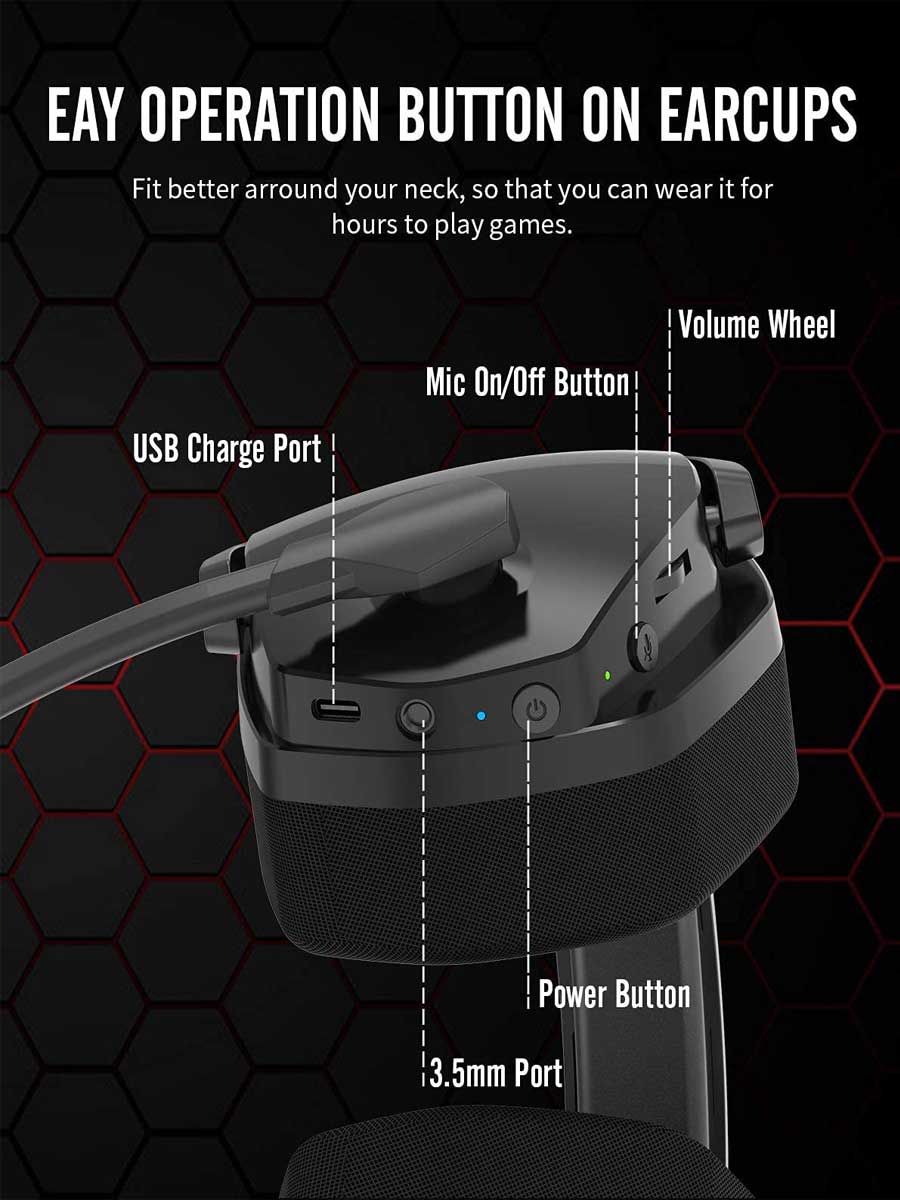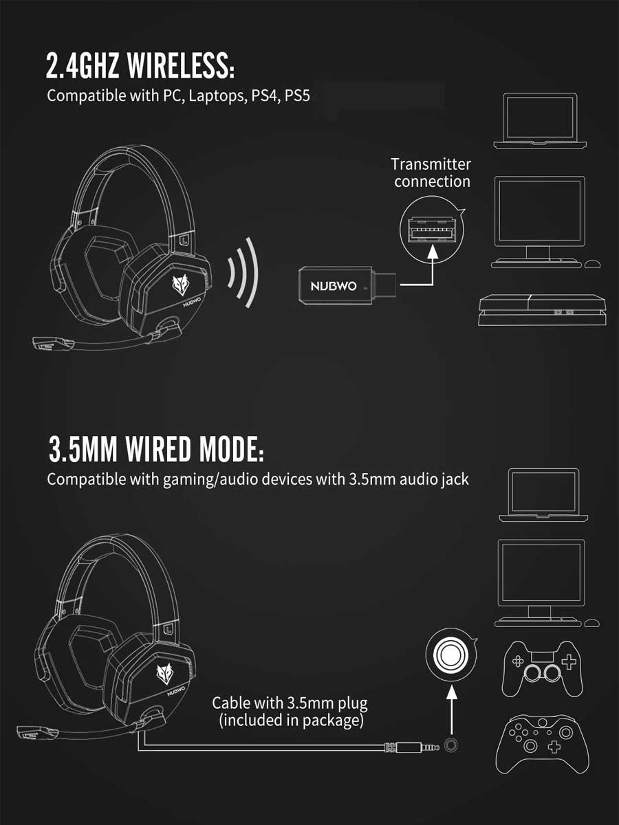 Most gaming headsets on the market are wired headphones, which brings annoying bridle in games. Now NUBWO G06 2.4 GHz Wireless Gaming Headset perfectly blends the advantage of wireless freedom and lag-free real-time transmission. Within 10 meters, you can move freely, react faster, communicate clearly, and lead your squad to victory. By the way, G06 has wired mode for all 3.5mm jack devices.