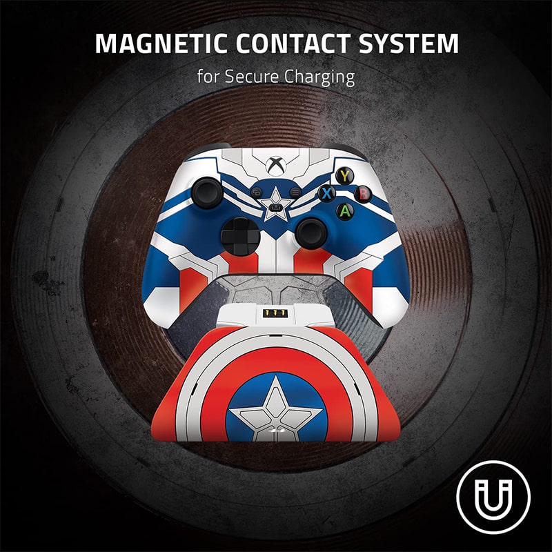 دسته ایکس باکس و پایه شارژر Razer طرح Captain America به همراه پایه شارژ کنترلر Razer مخصوص کنترلر ایکس باکس با طرح بسیار محدود سم ویلسون ملقب به کاپیتان آمریکا