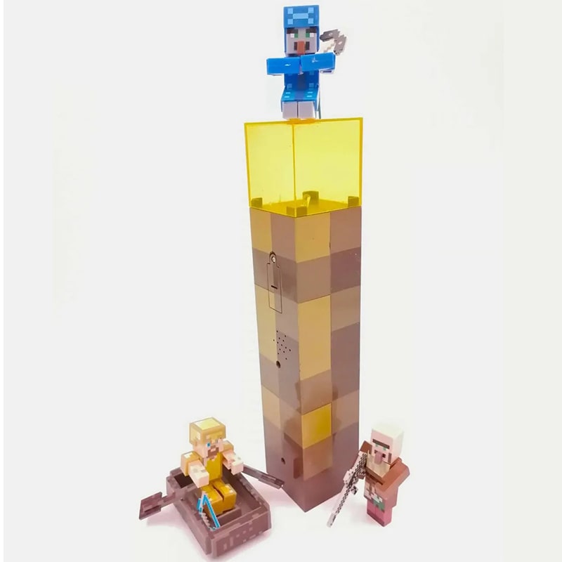 و برای اینکه تجربه بازی خود را به سطح بالاتری ببرید، این مجموعه ها با یک ابزار یا سلاح در اندازه کامل ارائه میشود تا فرزندانتان بتوانند خود را مانند یک شخصیت در دنیای خارقالعاده و دیجیتالی ماینکرافت احساس کنند. این ابزار ها نور و صدا تولید میکند که با فشار دادن یک دکمه فعال میشوند (این مجموعه شامل یک باتری است).