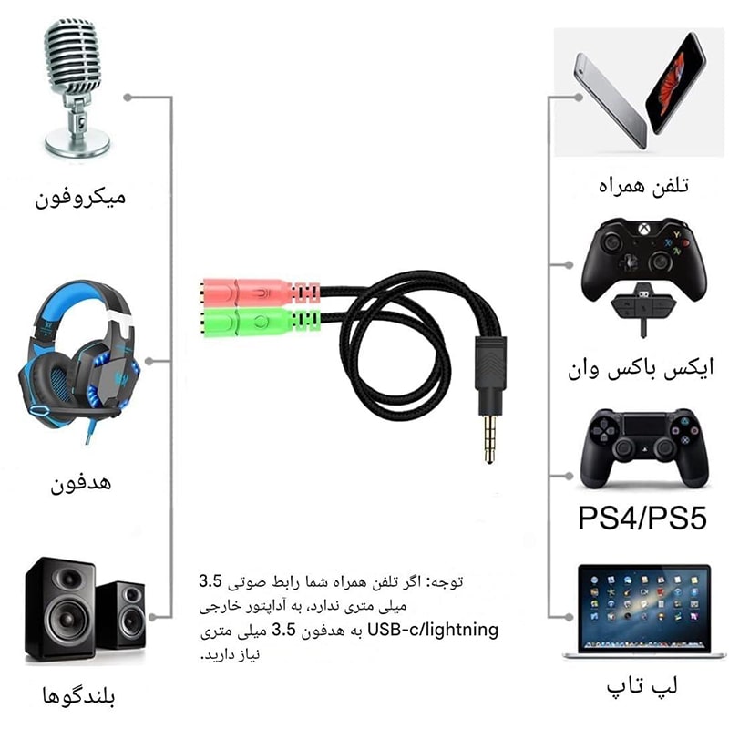 توجه: کابل برای استفاده های دیگر (اتصال دو ورودی صدا به یک دستگاه – استفاده از هندزفری تک فیش روی رایانه های خانگی و …) کاربرد ندارد و باید تبدیل های دیگری تهیه شود.