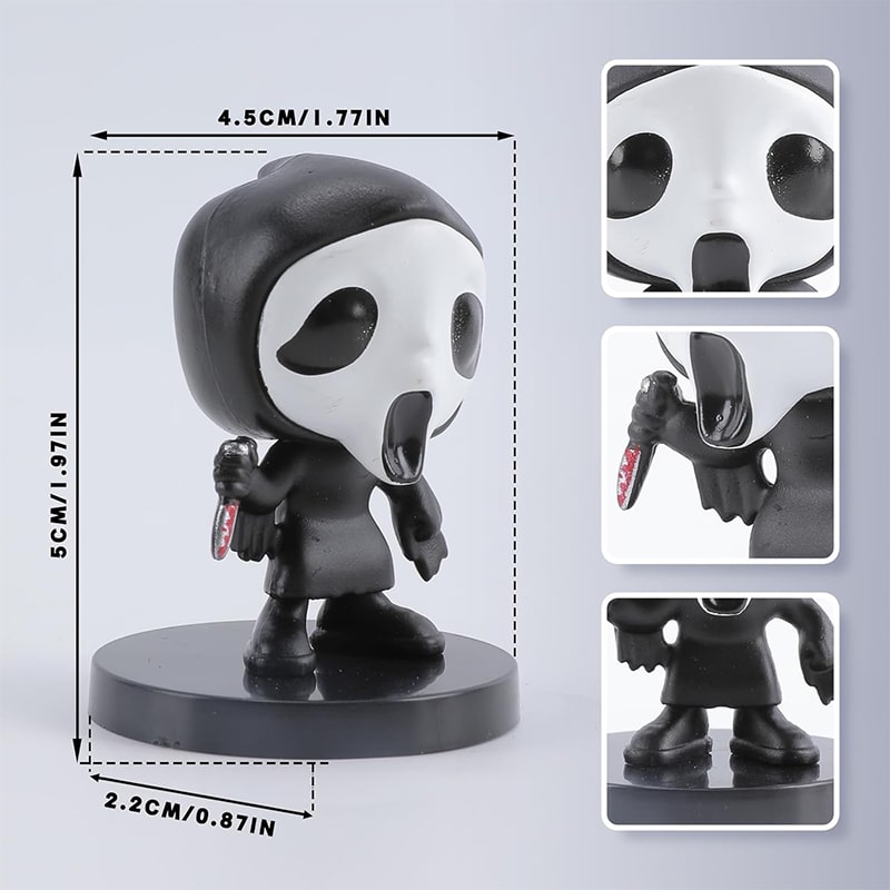 این اسباب بازی های ترسناک حدود ۵.۵ سانتی متر ارتفاع دارند و دارای یک پایه مشکی است که می تواند به طور ثابت روی میز بایستد. مینی فیگورهای ترسناک ست 10 عددی از جنس پی وی سی سازگار با محیط زیست با کیفیت بالا و رنگ های زیبا ساخته شده اند. این مجموعه ده عددی از شخصیت های ترسناک فیلم هایی چون جیغ و اره الهام و طراحی شدند، که می توانند باعث تخیل کودک شما و وارد شدن به دنیای فانتزی و ماجراجویی در آن بشوند. این مجموعه مینی فیگورها نه تنها برای هالووین مناسب است، بلکه هدیه ای ایده آل برای خانواده و دوستان در کریسمس، تولد و مهمانی های خانه جدید و البته بهترین هدیه برای عاشقان فیلم های ترسناک می باشند.