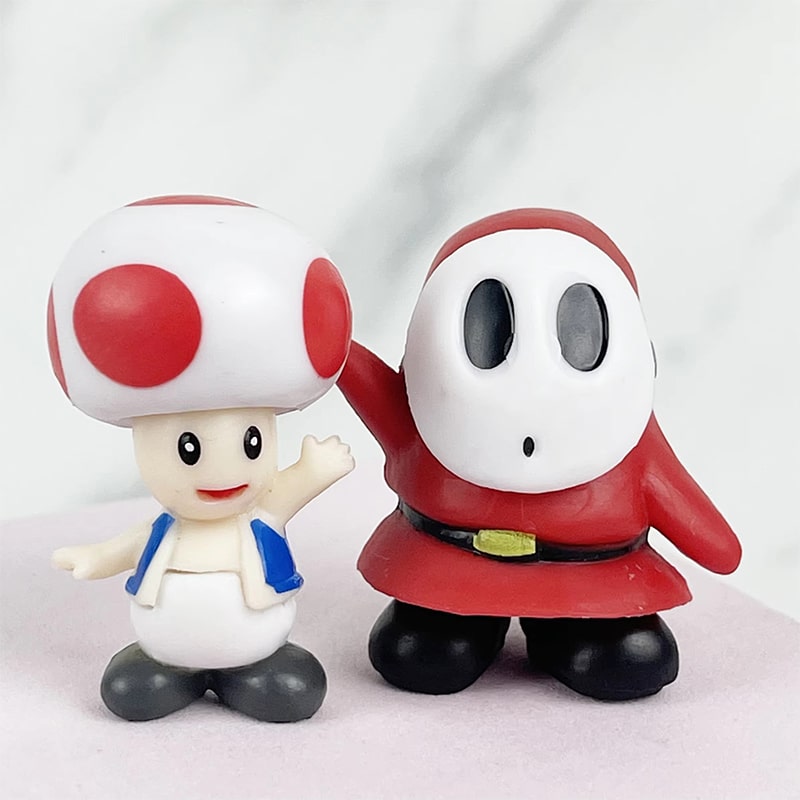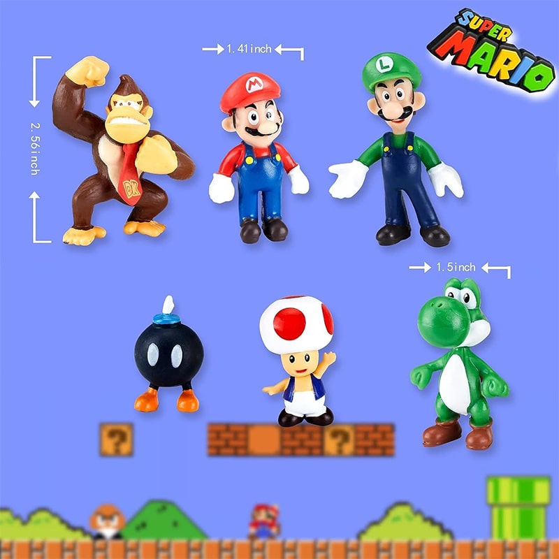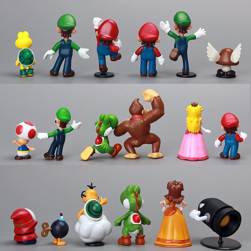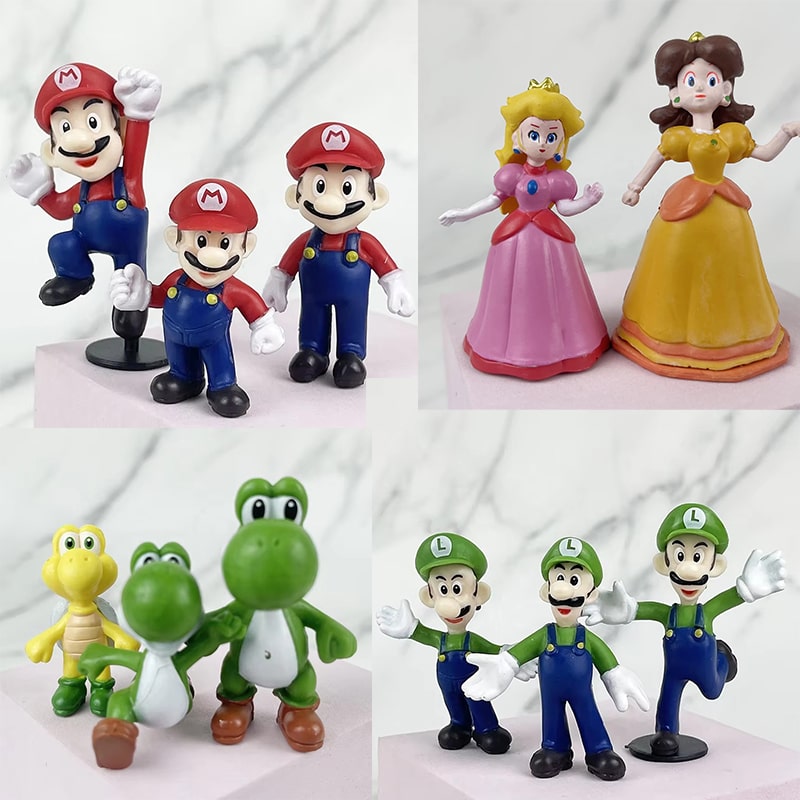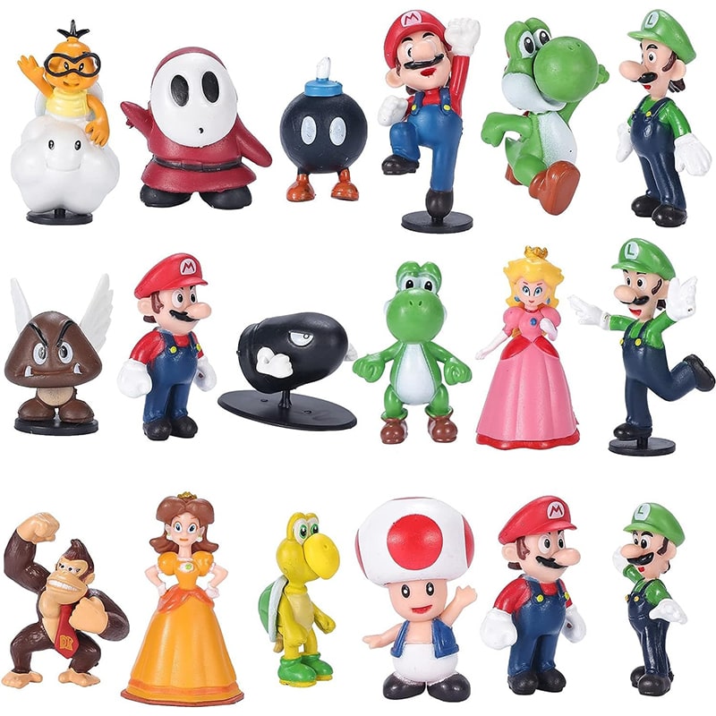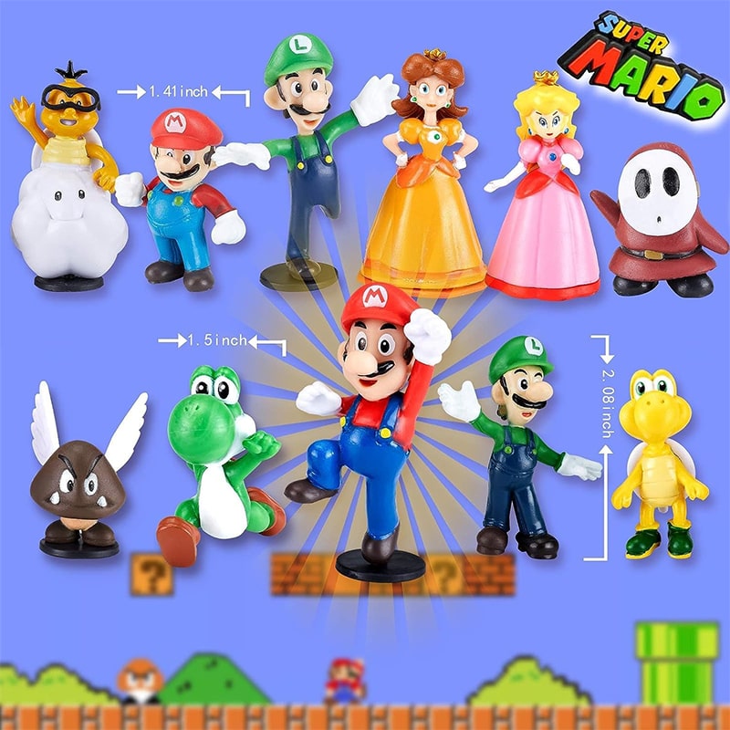 مینی فیگور خانواده ماریو Super Mario ست 18 عددی شامل شخصیتهای مختلف انیمیشن سوپر ماریو شامل ماریو، لوئیجی، پرنسس دیزی، پرنسس پیچ، یوشی، بوزر، دانکی کونگ، تود و… است. این فیگورها که از جنس پی وی سی بادوام ساخته شده است و به راحتی آسیب نمی بیند و نمی شکند، همه فیگورها بسیار زیبا طراحی شدند و برای استفاده کودکان یا قرار دادن در قفسه ها یا برای هدیه، تزئینات منزل، تزئینات خودرو، کلکسیون شخصیت عالی هستند. با رنگ های روشن، تصویر واضح، جزئیات خوب و همچنین شخصیت های دوست داشتنی متنوع، به اندازه کافی جذاب است و بچه های شما از بازی با آنها لذت خواهند برد. این اکشن فیگورها با اندازه ایی بین ۱ تا ۳ اینچ متغیر است که برای نگهداری در دست کودکان عالی است.