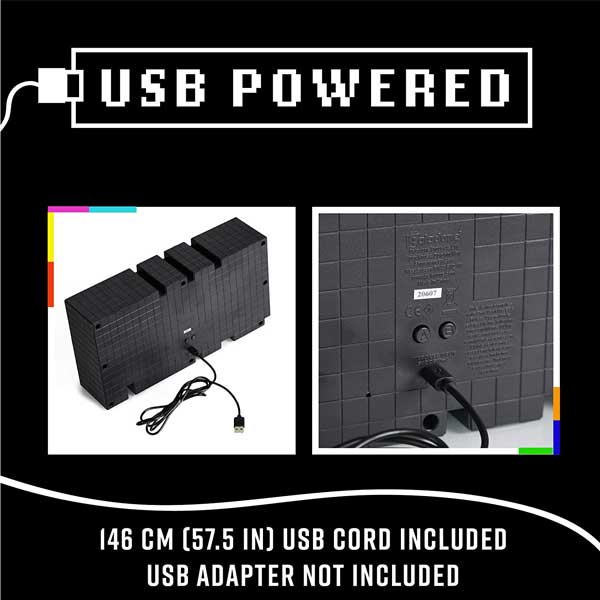 DETAILS: This homage to the 8 – bit gaming era stands 30 centimeters wide (approximately 12 inches) and is sound reactive and color phasing. It features the colors orange, blue, green, and purple.