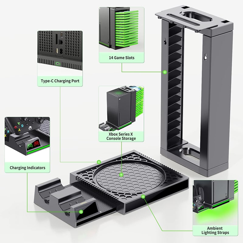 این محصول یک داک شارژ چندکاره برای کنسول ایکس باکس سری ایکس (Xbox Series X) از برند DOBE است. این داک علاوه بر شارژ کنترلرها، امکاناتی مانند خنککنندگی کنسول و نگهداری از دیسکهای بازی را نیز فراهم میکند.