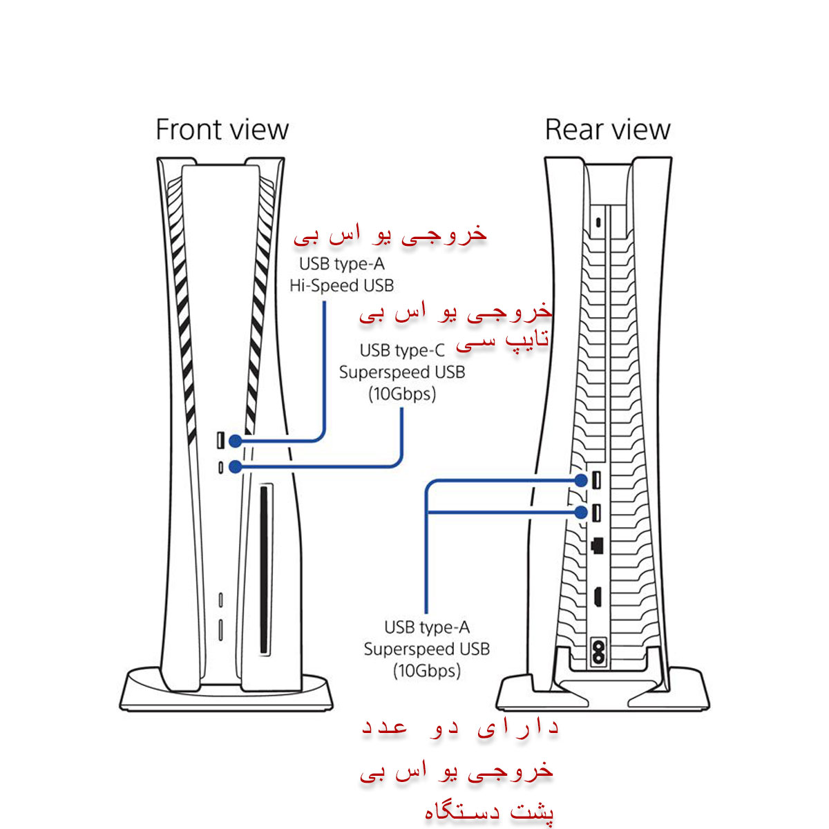 دو صفحه‌ی قوسی سفید رنگ بدنه‌ی اصلی و مشکی رنگ PS5 را در برگرفته‌اند. البته در نظر داشته باشید که به‌راحتی قادر به جدا کردن صفحه‌های کناری و رنگ‌آمیزی آن‌ها به‌صورت دلخواه خواهید بود. در نسخه‌ی دارای درایو دیسک بلو‌ری، شاهد از بین رفتن تقارن طراحی از نمای جلوی کنسول پلی استیشن 5 مدل PS5 Standard Edition هستیم. با اینکه تعبیه‌ی درایو بلوری به‌خوبی انجام شده‌ است، اما نسخه‌ی دیجیتالی از این لحاظ جلوه‌ی بصری بهتری را به همراه دارد.