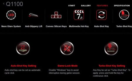 موس کیبورد و موس گیمینگ A4tech Bloody Q1100 محصول S2 نام داشته که با رزولوشن 3200 می تواند یک موس نیمه حرفه ای به حساب بیاید . از دیگر ویژگیهای S2 می توان به سوئیچینگ کلید موس با طول عمر بالا که در کلیک های طولانی فرسایش کمتری دارد ، عکس العمل کلیدها : کمتر 1 میلی ثانیه ، امکان تغییر رزولوشن بین 800 تا 3200 DPI اشاره کرد . صفحه کلید Q1100 دارای نور پس زمینه بوده که کاربر به راحتی می تواند آن را تغییر داده و از آن در زمان هایی که تاریکی اتاق ممکن است باعث کاهش دید کلیدها شود ، استفاده کرد .