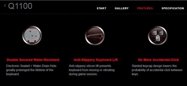 یکی دیگر از ویژگیهای این صفحه کلید طراحی ضد نفوذ آب Q1100 با مقاومت بالا تر و عمر بیشتر این در برابر سیالات خارجی می باشد.این کیبورد دارای قابلیت تنظیم نور میباشد .کلید های “ASDW” این کیبورد ازمواد سیلیکونی مقاوم ساخته شده .کلید space این کیبورد با قابلیت فنری بالایی همراه شده است که باعث افزایش عملکرد این کلید و برگشت سریع تر به وضعیت قبلی میشود .
