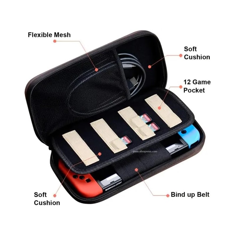 این کیف مخصوص کنسول نینتندو سوییچ دارای بدنهای محکم و مقاوم است که به وسیله آن میتوانید کنسول نینتندو سوییچ، دو عدد جوی کان و 12 عدد کارتریج نینتندو سوییچ را همه جا با خود داشته باشید. همچنین این کیف دارای جیب توری داخلی برای حمل لوازم جانبی دیگر مانند جوی-کان و کابل است. این کیف دارای طرح برجسته Sheikah Eye از بازی Legend of Zelda: Breath of the Wild است.