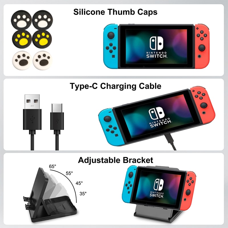یک قاب شفاف برای کنسول نینتندو سوییچ در این پک به همراه یک عدد محافظ صفحه شفاف مناسب نینتندو سوئیچ در این پک وجود دارد؛ که برای حفاظت نینتندو شما تعبیه شده اند. قاب محافظ سوییچ اولد شفاف ترکیبی از TPU نرم، ضربه گیر و باکیفیت بالا و مواد مقاوم در برابر آسیب ساخته شده است. محافظ صفحه نمایش با سختی اچ 9 که فوق العاده شفاف، با کیفیت بالا و مقاوم در برابر خش برای محافظت طولانی مدت از صفحه نمایش ،این محافظ با یک پوشش مخصوص پوشانده شده است که می توان آن را به راحتی از آب، خاک و اثر انگشت پاک کرد. علاوه بر این پد مخصوصی برای تمیز کردن صفحه نمایشگر نینتندو در این پک قرار دارد. پیش از نصب محافظ صفحه، ابتدا با این پد صفحه نمایشگر را تمیز کرده و سپس محافظ صفحه را روی نمایشگر نصب کنید.