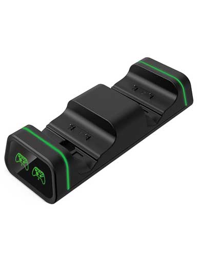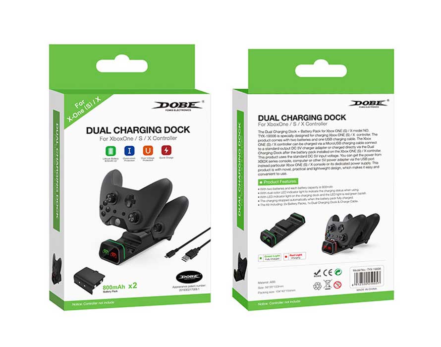 This Dual Charging Dock is specifically designed for charging Xbox One S/X controllers. It comes with two batteries ans one USB charging cable. The Xbox One S/X controller can be charged via a micro USB charging cable to a standard output DC 5V charger adapter or charged directly via the Dual charging dock after the battery pack is installed on the Xbox One S/X controller.