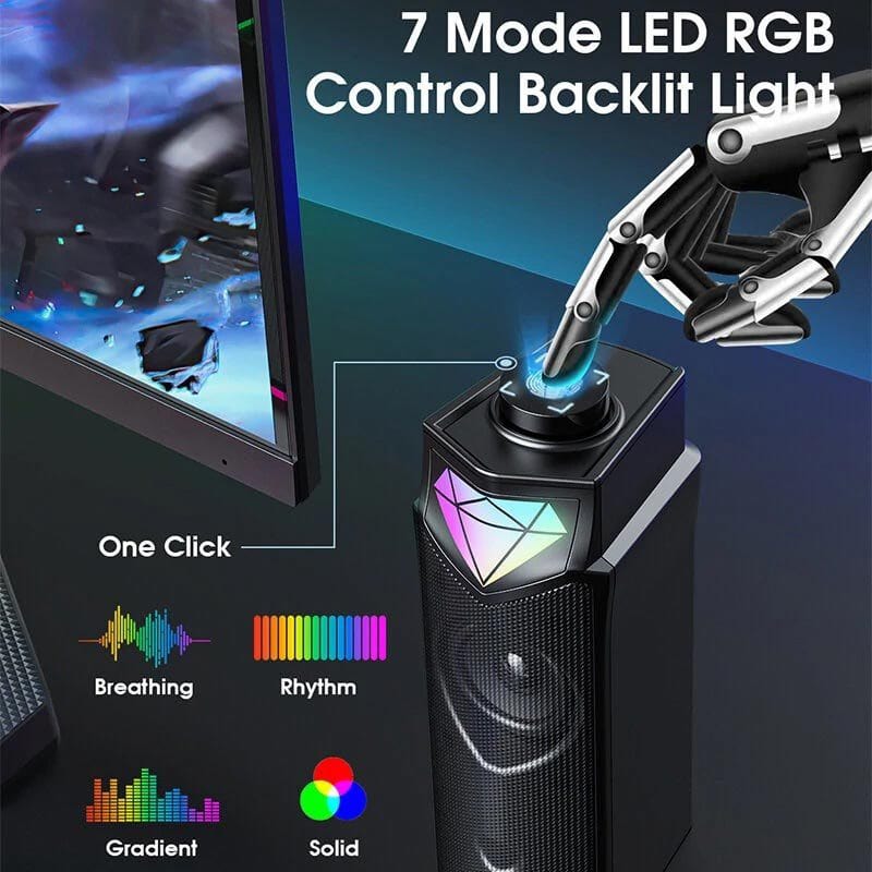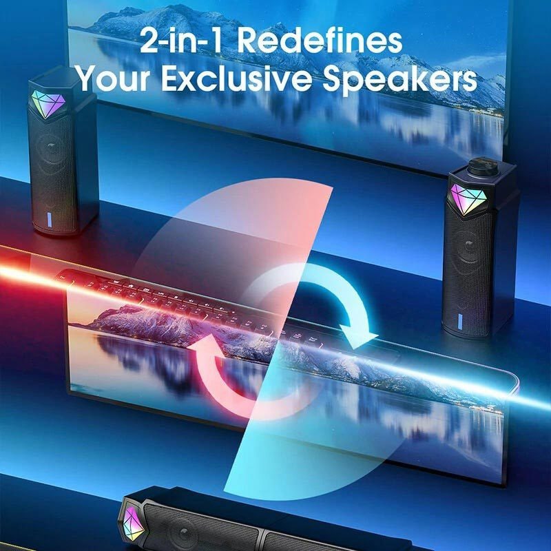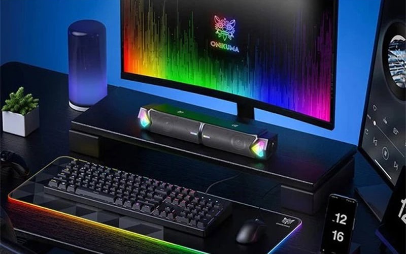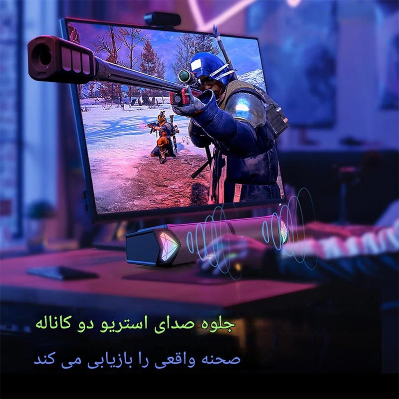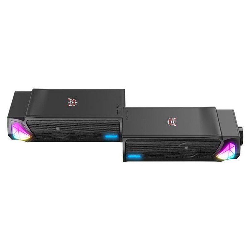 اسپیکر رومیزی بلوتوثی اونیکوما مدل Onikuma L1 یک اسپیکر دسکتاپ بلوتوثی و کابلی با کیفیت و دارای قابلیت RGB است که می تواند صدای استریو با کیفیت بالا را تولید کند. این اسپیکر دارای نور RGB با مودهای رنگی مختلف و مود صدا میباشد. نورپردازی RBG با حالت های مختلف که می توان آن را خاموش کرد. این اسپیکر را می توان به دو تکه چپ و راست تقسیم کرد یا بصورت یک ساندبار ادغام کرد. این محصول با رابط های اتصال USB و Bluetooth میتواند به هر سیستمی متصل شود، برای اتصال آن نیازی به نرم افزار درایور نیست. حتی بی نیاز از کابل AUXاست فقط کافیست آن را وصل کنید و استفاده کنید. اسپیکر رومیزی بلوتوثی اونیکوما مدل Onikuma L1 دارای کلید چند حالته برای تنظیم صدا و تغییر نوع اتصال و RGB است. اسپیکر پیش رو می تواند فرکانس های پایین تا 60 هرتز و بالا تا 20 کیلوهرتز را پخش کند و توان خروجی هر کدام از بلندگوهای آن 5 وات است. اسپیکر اونیکوما گزینه ای مناسب برای گوش دادن به موسیقی، تماشای فیلم و گیمینگ است.