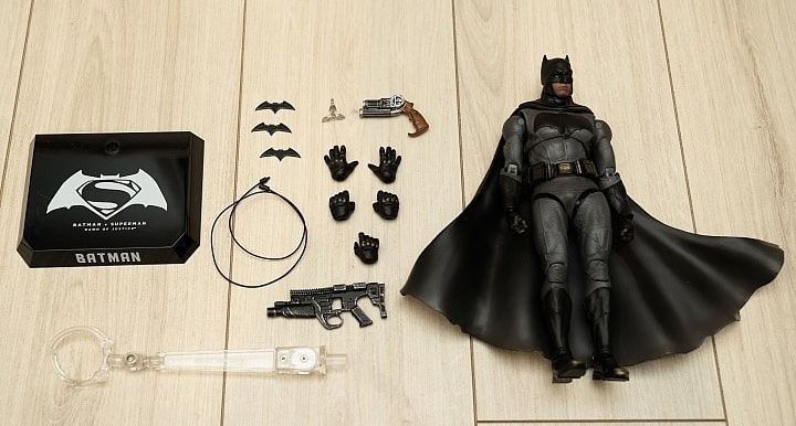 این اکشن فیگور حدود 20 سانتی متری با اسلحه قلاب دار و بترنگ های بتمن عرضه می شود. بترنگ های بتمن از فلز ریخته گری شده ساخته شده اند. همچنین اکشن فیگور بتمن علیه سوپرمن Beast Kingdom DAH-001 با یک پایه نمایش با برند فیلم ارائه می شود.