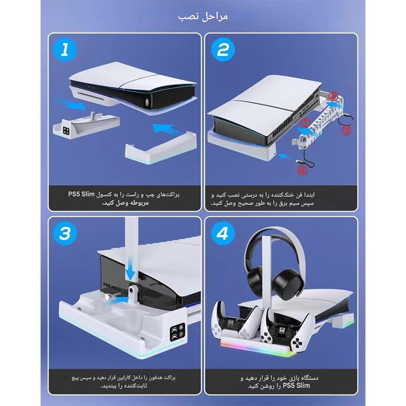 1- این براکت چند منظوره PS5 اسلیم و پرو iPEGA مدل PG-P5S039 با فضایی برای دو کنترلر PS5 و هدفون شما، تمام وسایل بازی ضروری شما را در یک مکان جمع می کند و پایه ای شیک و کاربردی برای کنسول شما ایجاد می کند.