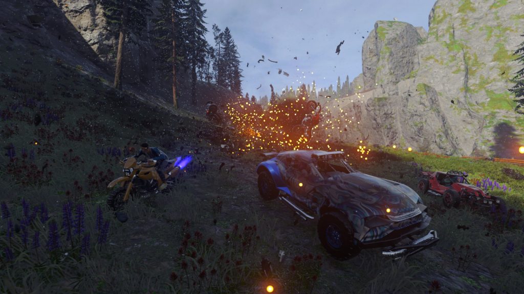 Onrush is an arcade-style car combat game in which players drive cars, motorcycles and off-road vehicles across large levels over hilly terrain. The game features a boost mechanic that players can use to increase their vehicle’s speed. Players earn boost by performing stunts and slamming rival combatants to take them out.