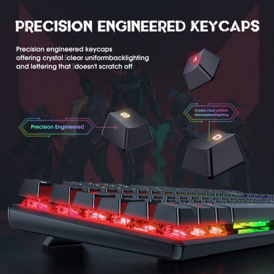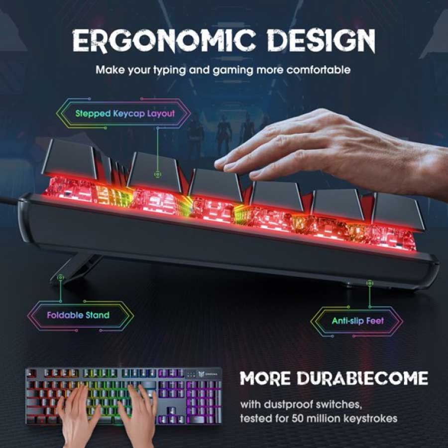 خرید کیبورد گیمینگ اونیکوما Onikuma G27 به افراد حرفه ای توصیه می شود و دکمههای کیبورد گیمینگ اونیکوما از جنس ABS می باشد همچنین دارای سوییچهای مکانیکی است که علاوه بر عملکرد سریع، حس لرزش کوچکی را منتقل میکنند و مقاومت بسیار خوبی در مقابل فرسایش دارد