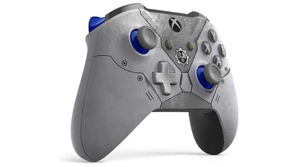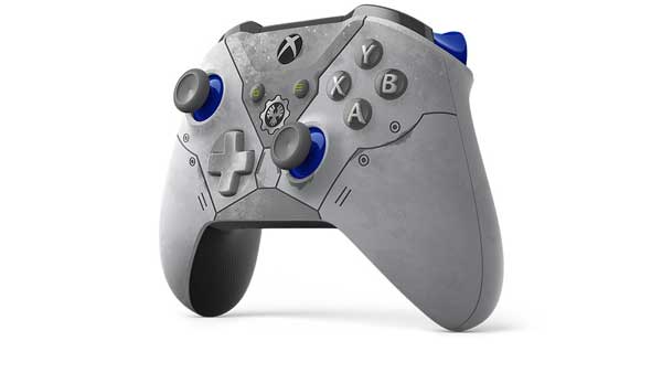 شده اما خود آن با رنگ سفید، رنگ پشت دسته بازی ایکس باکس وان مدل Gears 5 Kait Diaz Edition طوسی انتخاب شده و کلیدهای RT و LT به رنگ آبی مزین شده است.