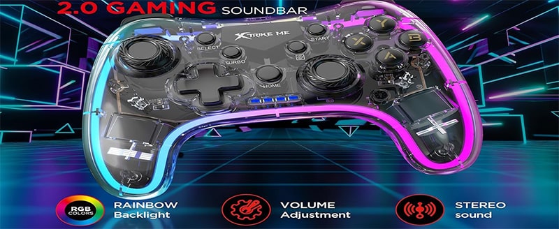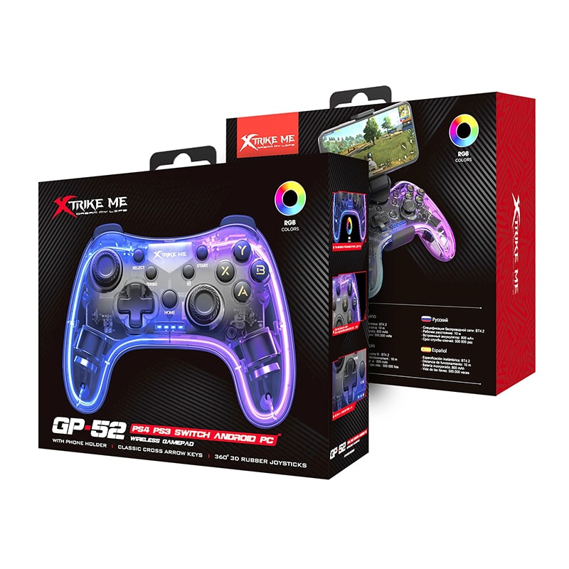 دسته بازی بی سیم XTRIKE ME مدل GP-52 از کیفت ساخت بالایی برخوردار بوده و طراحی زیبا و شفاف آن به همراه LED های جذاب ابن گیم پد رو به یک گزینه ی ایده آل برای هر گیمری تبدیل میکنه.دسته بازی بی سیم XTRIKE ME مدل GP-52 قابلیت اتصال به اندروید،IOS،نیتندو،PS4و PC رو از طریق اتصال بی سیم(بلوتوث) را دارد و به وسیله ی کیفیت ساخت و شوک های قدرتمند تجربه ای فوق العاده رو برای شما به ارمغان میاره.به وسیله ی باتری 800 میلی آمپری میتوانید 8 الی 12 ساعت از گیم پد استفاده کنید و به وسیله ی گیره ی نگهدارنده گوشی تلفن همراه خودتون رو روی گیم پد قرار بدین و از بازی نهایت لذت رو ببرین.برای اتصال به گوشی موبایل از نرم افزار رایگان ShootingPlus V3 استفاده کنید.