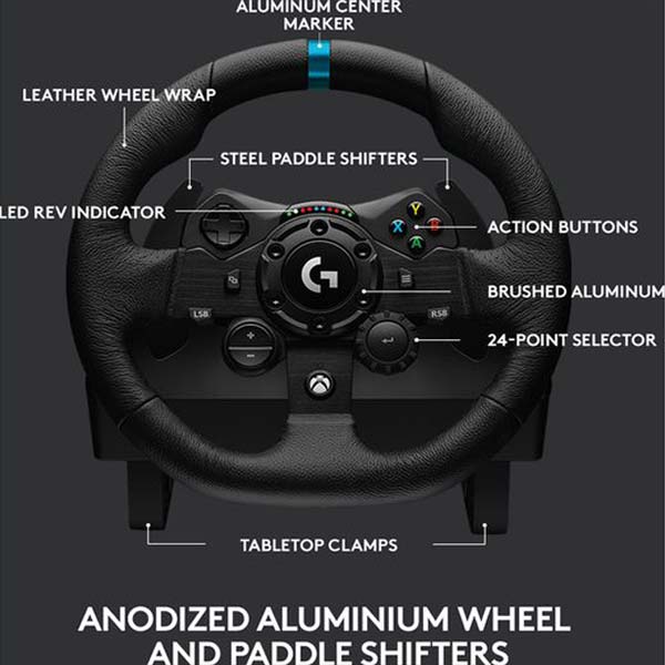 طراحی کلاسیک فرمانهای لاجیتک، در فرمان بازی لاجیتک G923 ویژه کنسول XBOX ONE شکل مدرنی به خود گرفته است. رنگ بندی جدید، فلز صیقلی برجسته، چرمدوزی مانند ماشینهای مسابقه و پدالهای براق و صیقلی به G923 سر و شکل مدرن، پیشرفته و حرفهای دادهاند.