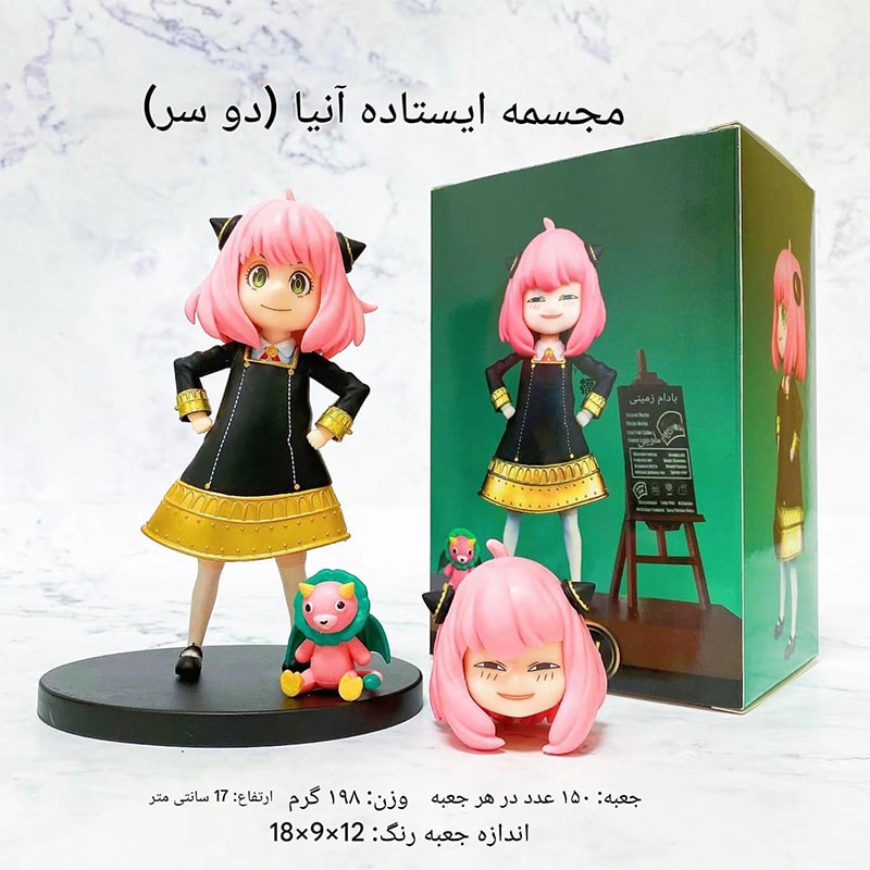 اقلام بسته: فیگور آنیا با یک سر اضافه و همراه یک عروسک و پایه می باشد