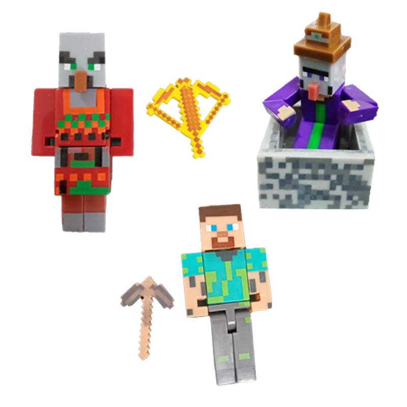 مجموعه اسباببازیهای ماینکرافت خود را با مجموعه های Village & Pillage، یکی از بهترین بهروزرسانیها در تاریخ این بازی محبوب، بروز کنید. در این مجموعه در کنار شخصیتهای سنتی استیو و الکس، میتوانید با زامبیها، خوکزنها یا نسخههای مختلف روستاییان و غارتگران، و همچنین سلاحها و ابزارهای جدیدی مانند کمانهای پولادی، تیرکمان، تفنگ ساچمهای و نیزه سهشاخ بازی کنید. همچنین میتوانید مینی فیگورها را در قایقهای پارویی یا واگنهایی که برای غلتیدن درست شدهاند، سوار کنید.