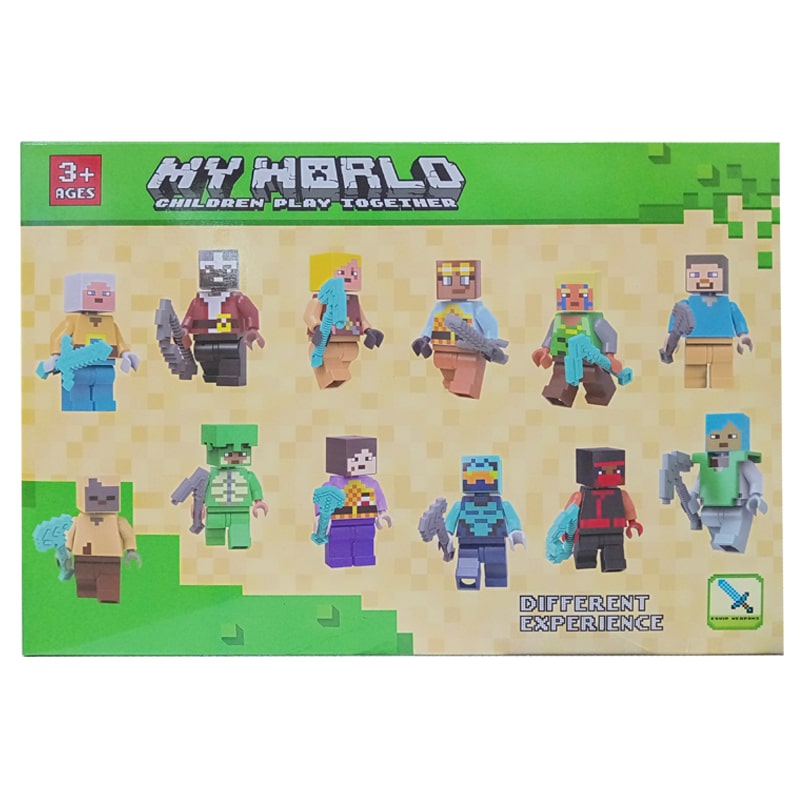در لگو مای ورلد 12 عددی Minecraft کد 33100 علاوه بر مینی فیگورها، تعدادی لوازم جانبی ماینکرافت نیز می شود: شمشیر، کمان، کلنگ، تبر و نیزه.