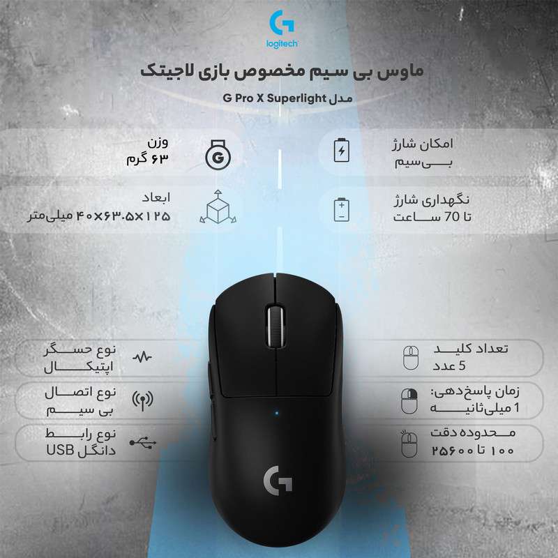 مشخصات ماوس گیمینگ بی سیم لاجیتک مدل logitech G Pro X superlight