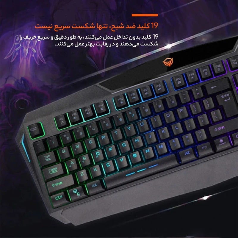سایر قابلیتهای کیبورد: چراغ پس زمینه صفحه کلید RGB چهار رنگ، 19کلید با خاصیت Anti Ghosting ،صفحه کلید غشایی با کیفیت بالا، طراحی ارگونومیک، 11کلید چندرسانهای، اسکرول موس به صورت بی صدا یا silent…