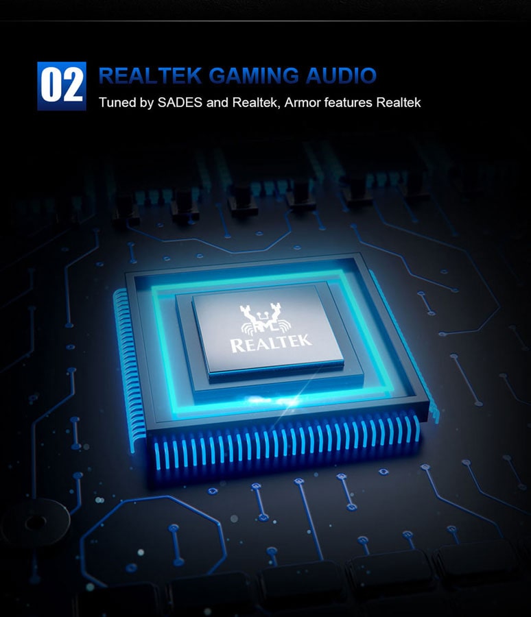 The SADES Armor Gaming Headset is a fully packed lightweight headset equipped with High Definition Realtek gaming audio, rich RGB lighting effects, a flexible microphone and big leather ear muffs that provide an extreme noise-cancellation function. Tuned by SADES and Realtek, the SADES Armor headset features Realtek Gaming Audio. There are 4 Realtek effects available, which help to provide a broader sound field, superior dialogue clarity and also help to recover missing audio detail and normalizes the sound which allows for greater in game immersion with an all-round better listening experience. With 7.1 surround sound game immersion is further improved and allows users to accurately hear where enemies or other players are in game.