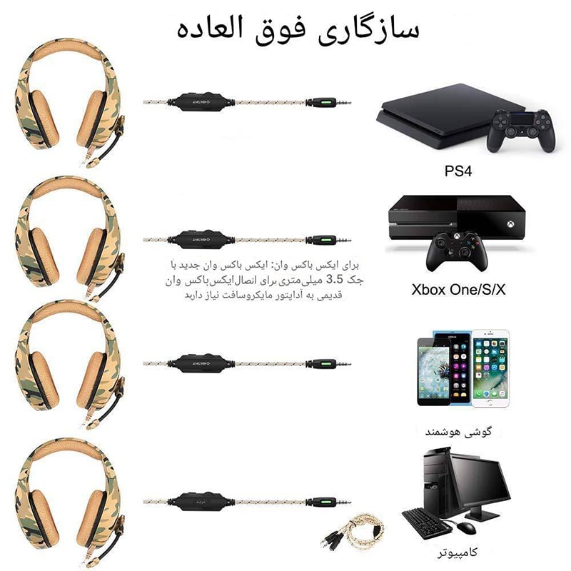 طراحی استتار: طراحی هدفون بازی K1B به شما این امکان را می دهد که از احساس غوطه وری بیشتری در هنگام بازی لذت ببرید. هدف این طراحی این است که به شما کمک شود بازی های تلفن همراه را راحت تر و سریع تر انجام دهید. و چون بازیکنان بیشتر و بیشتری عاشق بازی های نظامی هستند، بنابراین یک ظاهر استتار طراحی شده تا به بازیکنان کمک شود تا خودشان را به واقعیت میدان نبرد بازی برسانند. میکروفن حساس آن با ساختار نرم طراحی خود که دوام بیشتری دارد، می تواند به چرخش 120 درجه دست یابد. سازگاری آن از دیگر ویژگیهای آن است. این محصول برای اکثر دستگاه های دارای پورت هدفون/میکروفون 3.5 میلی متری مناسب است. مثل کامپیوتر و لپ تاپ. ولی برای PS4، xbox one جدید، تلفن همراه، iPhone، iPad، mp3، mp4، خط تقسیم 2 به 1 مورد نیاز است. سایر ویژگیهای آن عبارتند از : بلندگوی نئودیمیوم مغناطیسی 50 میلی متری با دقت بالا، میدان صوتی واضحی را به شما ارائه می دهد که گویی واقعا در صحنه بازی هستید با کیفیت صدای استریو بیس واضح و عمیق. با کنترل کننده ولوم چرخشی و بی صدا کردن کلید میکروفون به طور موثری از پیچیدن کابل 2.2 متری جلوگیری می کند و به شما امکان می دهد به راحتی صدا را کنترل کنید و میکروفون را بی صدا کنید. هدبند کاملا قابل تنظیم، تناسب کامل را با اندازه های مختلف سر (مناسب برای بزرگسالان و کودکان) و راحتی در بازی های طولانی مدت تضمین می کند.