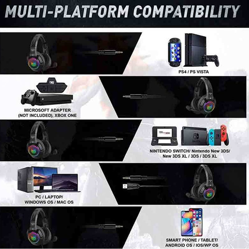 دارای کابل متصل با سوکت های USB برای نورپردازی و جک 3.5 میلی متری صدا برای صدا و میکروفون همراه با تبدیل 1 به دو AUX