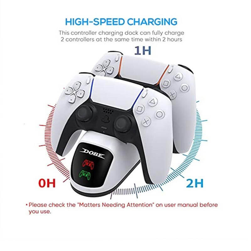 لطفا توجه داشته باشید: کابل مخصوص با 2 ورودی USB در جعبه دستگاه قرار دارد تا به هر دو ورودی شارژ دستگاه پلی استیشن به طور همزمان متصل شود و از سمت دیگر به شارژر دسته ها متصل شود تا عمر دسته های شما را بیشتر کند و همچنین در کمترین زمان ممکن دسته ها را برای شما شارژ کند در این روش ، کنترل کننده ها می توانند در کمتر از 2 ساعت به طور کامل شارژ شوند. ایمنی هوشمند تراشه محافظ داخلی از شارژ اضافی محافظت می کند و محصول مجهز به طراحی ضد لغزش است. با شارژ کامل ، منبع تغذیه به طور خودکار قطع می شود تا دستگاه شما از آسیب احتمالی محافظت کند.
