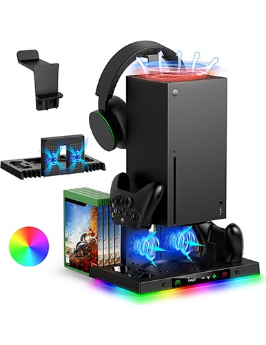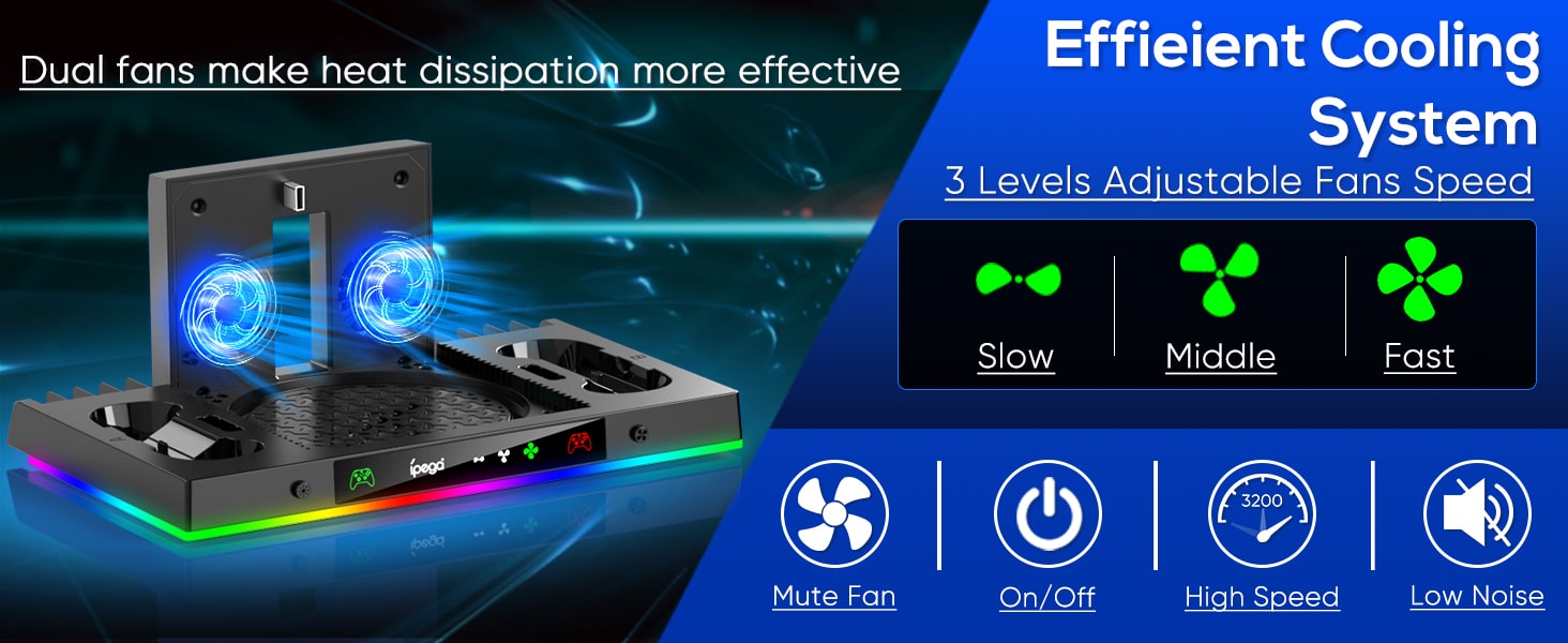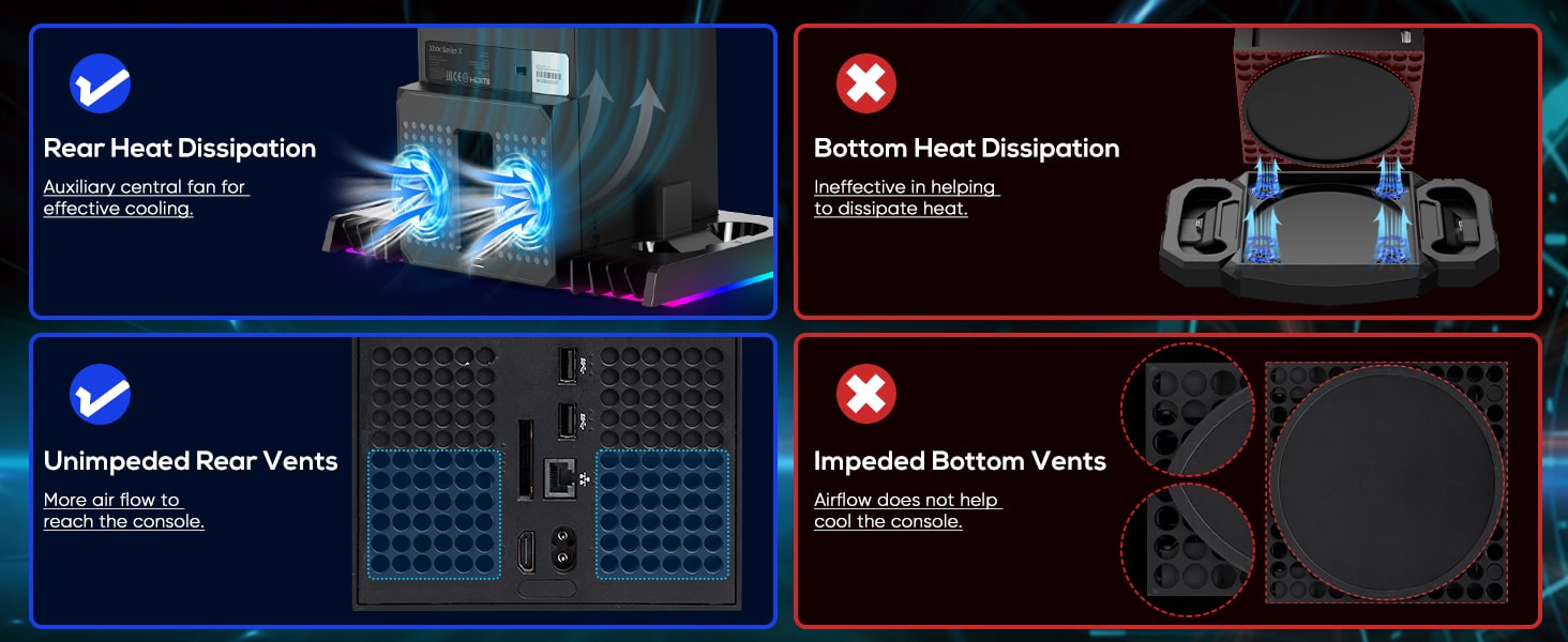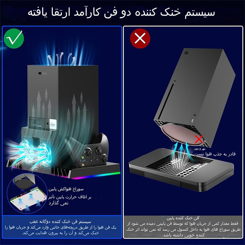 نکته دیگری که در این محصول میتواند نظر شما را به خود جلب کند، فنهای خنککنندهای است که درون این پایه چند منظوره جای گرفتهاند. برای استفاده از این فنها کافیست تا کنسول خود را بر روی این پایهها قرار دهید و با استفاده از آنها به خنکسازی و بهبود جریان هوای درون کنسول کمک کنید. در واقع با استفاده از این فنها کمک میکنید تا هوای خنک جایگزین هوای گرم درون کنسول شود و بدین ترتیب عمر کنسول شما افزایش پیدا کند.