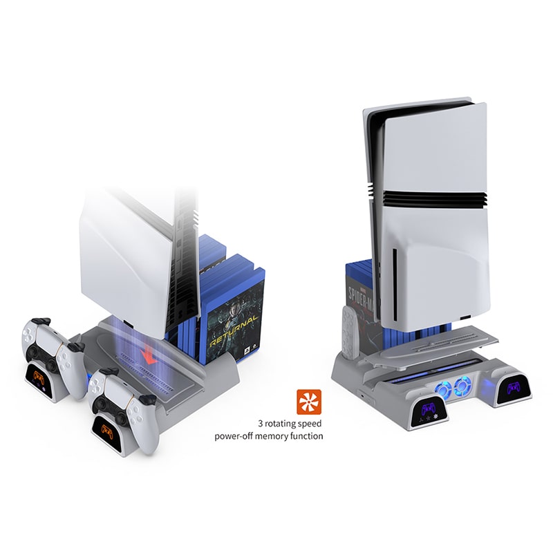 نگهداری همزمان دیسک، ریموت و کنترلر: دیگر نیازی به پراکندگی دیسکها و لوازم جانبی ندارید. این استند فن دار PS5 دارای جایگاه نگهداری ۱۱ عدد دیسک بازی، جای مخصوص ریموت کنترل مدیا یا هدست، استند نگهداری ۲ عدد کنترلر