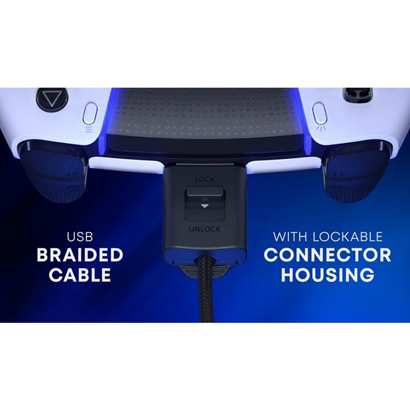 دوال سنس اج به صورت بیسیم به پلی استیشن 5 وصل میشود، اما همانند دوال سنس، میتوانید آن را با کابل USB-C به کنسول وصل کنید و همزمان با شارژ، بازی کنید. کابل USB-C این کنترلر، علاوه بر بدنه ضخیم و مقاومی که دارد، دارای یک قفل در محل اتصال به کنسول است تا از جدا شدن تصادفی کابل جلوگیری شود.
