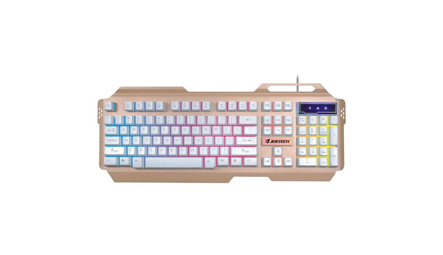کیبورد گیمینگ جرتک مدل Jertech K909 با رنگ های خاکستری، طلایی و مشکی مناسب برای انجام بازی های کامپیوتری می باشد. این کیبورد دارای 104 کلید بوده که حروف فارسی روی آن ها حک شده است. توسط اتصال سیمی و بوسیله پورت USB به کامپیوتر شما متصل می گردد.
