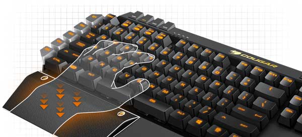 کیبورد گیمینگ کوگار مدل Cougar 500K علاوه بر پد کمکی استاندارد از یک پد اضافی برای ارایه حداکثر کارایی در هنگام اجرای بازیهای شوتر اول شخص بهره میبرد تا با استقرار درست دستان شما در ارتفاع مناسب، دسترسی به کلیدهای WASD و کلیدهای ترکیبی G را آسانتر نماید.