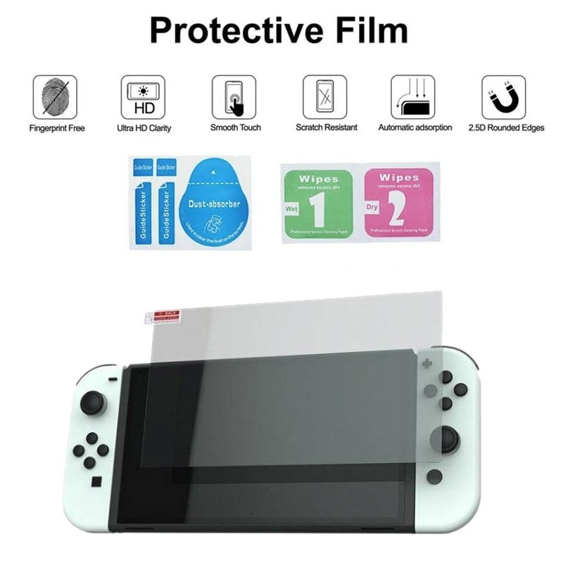 یک قاب شفاف برای کنسول نینتندو سوییچ در این پک به همراه یک عدد محافظ صفحه شفاف مناسب نینتندو سوئیچ در این پک وجود دارد؛ که برای حفاظت نینتندو شما تعبیه شده اند. قاب محافظ سوییچ اولد شفاف ترکیبی از TPU نرم، ضربه گیر و باکیفیت بالا و مواد مقاوم در برابر آسیب ساخته شده است. محافظ صفحه نمایش با سختی اچ 9 که فوق العاده شفاف، با کیفیت بالا و مقاوم در برابر خش برای محافظت طولانی مدت از صفحه نمایش ،این محافظ با یک پوشش مخصوص پوشانده شده است که می توان آن را به راحتی از آب، خاک و اثر انگشت پاک کرد. علاوه بر این پد مخصوصی برای تمیز کردن صفحه نمایشگر نینتندو در این پک قرار دارد. پیش از نصب محافظ صفحه، ابتدا با این پد صفحه نمایشگر را تمیز کرده و سپس محافظ صفحه را روی نمایشگر نصب کنید.