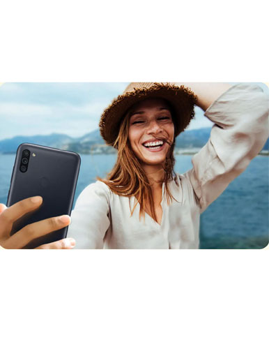 با وجود اینکه این مدل یک گوشی پایینرده است؛ اما ترکیب لنز بکار رفته در آن برای این رده یک امتیاز محسوب میشود؛ زیرا تقریباً از تمام انواع لنزها برای ثبت عکس و فیلم در آن استفاده شده است. گلکسی M11 به دوربین سهگانه با لنز اصلی ۱۳ مگاپیکسلی، لنز اولتراواید ۵ مگاپیکسلی و لنز ۲ مگاپیکسلی سنجش عمق مجهز شده است. دوربین گوشی از قابلیتهای دیگری نظیر عکسبرداری پانوراما، HDR، حالت پرتره و فیلمبرداری فول.اچ.دی با سرعت 30 فریم برثانیه برخوردارست. این دوربین در فضای باز و نور مناسب کارآیی مطلوبی داشته؛ اما در محیط بسته و کمنور نباید انتظار زیادی از آن داشت. دوربین سلفی آن نیز 8 مگاپیکسلی بوده که از قابلیت فیلمبرداری فول.اچ.دی با سرعت با 30 فریم و HDR بر ثانیه نیز پشتیبانی میکند. تصاویر ثبت شده و تماسهای ویدئویی برقرار شده توسط این دوربین کیفیت خوبی دارد.