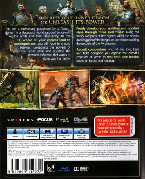 خلاصه بازی : بازی کامپیوتر Bound by Flame مرز آتش , یکی از بازی های سبک اکشن و  نقش آفرینی است که استودیو Spiders Games سازنده آن بوده و قرار است در تاریخ 9 می سال ۲۰۱۴ برای پلتفرم XBox360, PS3, PC بوسیله Focus Home Interactive منتشر گردد . هنوز از موضوع اصلی داستان بازی چیز دقیقی منتشر نشده است ولی این طور که به نظر می رسد بازی دارای سه قهرمان است که در قرون وسطا زندگی می کنند و به جنگ دیو آتش می روند . در این راه با خطرات مختلف و موجوداتی عجیب و وحشتناک روبرو می شوند . داستان حول شخصیت اصلی بازی که با شیطان معامله کرده و قدرت های خارق العاده ای به دست آورده است می چرخد . در این بازی نیز مانند بسیاری از بازی های دیگر , پلیر حق انتخاب بین خوب و بد را دراست و همین انتخاب ها بر پایان بازی تاثیر گذار است .