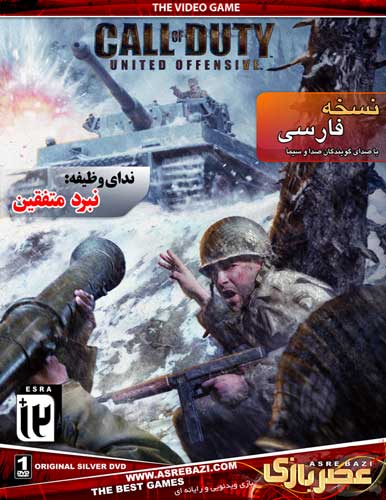 بازی کامپیوتری CALL OF DUTY UNITED OFFENSIVE – ندای وظیفه: حمله متفقین نسخه فارسی یک بازی تیرانداز اول شخص می باشد که توسط Gray Matter Interactive توسعه و در سال 2004 توسط Activision برای مایکروسافت ویندوز منتشر شد. این نسخه یک بسته الحاقی مربوط به Call of Duty 1 می باشد. همچنین خط داستانی بازی نیز مربوط به جنگ جهانی دوم است. در این نسخه پیشرفت چشم گیری نسبت یه سری قبل شاهد هستیم، جدا از بخش مولتی پلیر قسمت تک نفره به صورت بسیار خوبی پیشرفت کرده است.