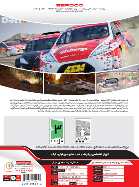 بازی کامپیوتر DiRT 4 یک بازی شبیهساز مسابقات رالی بوده و در آن شاهد شبیهسازی کامل و لایسنس مسابقات FIA World Rallycross Championship هستیم. همچنین بیش از ۵۰ ماشین مختلف در این بازی وجود دارند و بازی دارای بخشهای تکنفره و چندنفره غنی است. یکی دیگر از ویژگیهای جدید بازی کامپیوتر DiRT 4 قابلیتی به اسم Your Stage است که با استفاده از آن میتوانید پیش از آغاز مسابقه یک سری المان را شخصیسازی کنید و سپس بازی بر اساس انتخابهای شما، یک مسیر برای شما طراحی خواهد کرد که حتی میتوان آن را با دیگر گیمرها به اشتراک گذاشت. Dirt 4 به معنی واقعی کلمه یک بازی بینقص و عالی است که استانداردهای جدیدی برای بازیهای شبیهساز رالی تعیین میکند. علاوه بر این، بازی به شکلی طراحی شده که هم مخاطبین تازهکار بتوانند از آن لذت ببرند و هم کاربران حرفهای حس و حال یک بازی رالی واقعی را تجربه کنند.همچنین داشتن جلوههای بصری زیبا و تعداد بسیار زیاد پیستها،