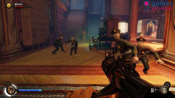 The player controls Booker Dewitt throughout the game, eventually working with the AI-controlled Elizabeth. Like previous BioShock games, the player uses a combination of weapons, clothing called Gear that offer unique attributes, and psychokinetic powers granted through Vigors. Elizabeth’s powers can also be used to help fight hostile forces. In contrast to the limited spaces of the underwater city of Rapture, the openness of Columbia provides for more dynamic combat, including combat that takes place aboard the city’s Sky-Line rollercoaster-like rail system. Downloadable content for the game includes a story-based mission, Burial at Sea, that links Infinite’s story to that of the original BioShock game.