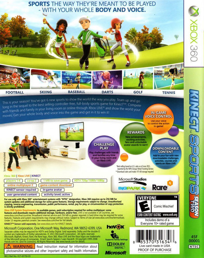 بازی Kinect Sports Season Two ایکس باکس 360 یک بازی ویدئویی در سبک ورزشی و شبیه سازی است که توسط شرکت Rare با همکاری BigPark توسعه یافته و به وسیله Microsoft Studios در اکتبر 2011 برای کنسول ایکس باکس 360 منتشر شده است. برای اجرای این بازی نیازمند وسیله جانبی Kinect هستید و باید بر روی کنسول شما نصب شده باشد. این دوربین به کاربران ایکس باکس اجازه میدهد تا بدون لمس کردن هیچ کنترلگری بتوانند تمامی اجزای موجود بر صفحه را به کنترل خود در بیاورند.