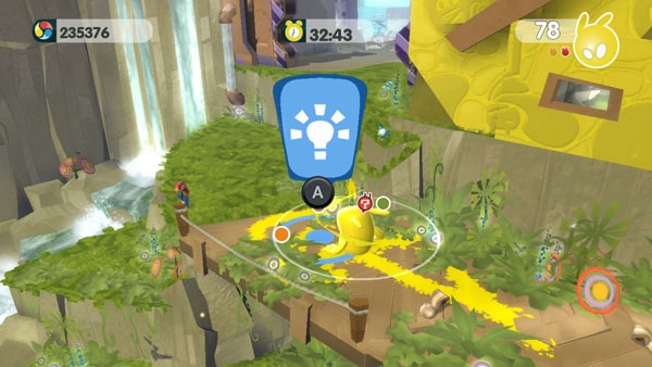 However, new gameplay additions have been added. One example is Blob’s new ability to perform a powerful dash attack, which breaks through obstacles and kills most foes, at the expense of a sizable amount of paint points. Furthermore, as the player progresses through the game, they obtain “inspiration points”, which are used at the Idea Emporium to purchase upgrades for Blob, such as increased paint capacity and defensive shields. Power-ups feature within the levels as well: the magnetic Wrecking Ball allows Blob to roll up metal surfaces, sink underwater, and destroy any enemy easily; the Hazmat Suit protects Blob from any passive hazards such an ink and hotplates; the Graviton Bomb temporarily transforms Blob into a devastating black hole; the Re-Gen constantly replenishes Blob’s paint points; and the Rainbow gives Blob infinite paint points and gives him the use of all seven colors at once.