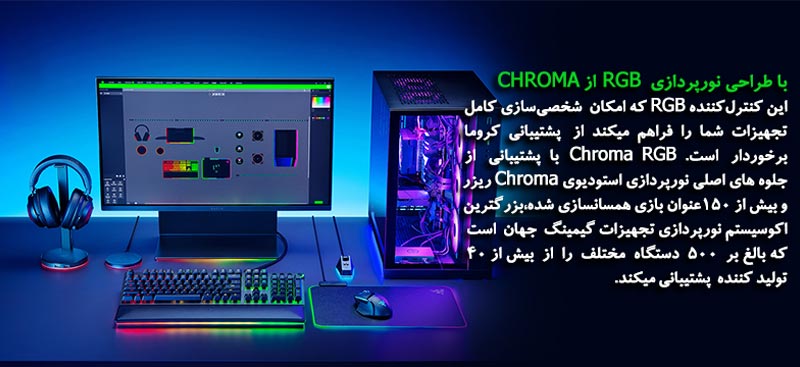 با استفاده از واحد کنترل پردازنده RGB کرومای ریزر و از طریق نرم افزار اختصاصی synapse 3 نرم افزاری که برای پشتیبانی از بزرگترین تجهیزات بازی جهان طراحی شده استفاده کنید.